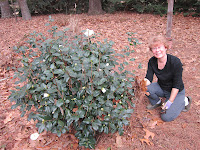 quarters" located at Massee Lane Gardens in Fort Valley, Georgia. Diana specifically selected and purchased a beautiful white Camellia named "Emmett Barnes" which has grown very erect and strong. So, I took a picture of Emmett Barnes, and also took a picture of the bush with Ms. Diana nealing close by. Camellias are beautiful.